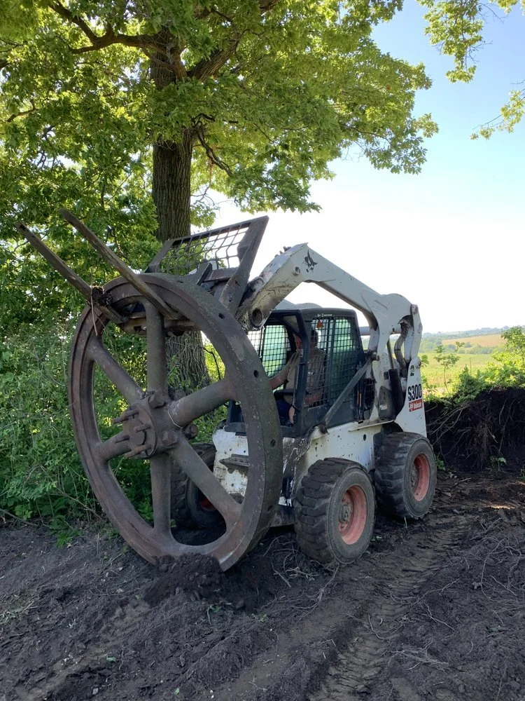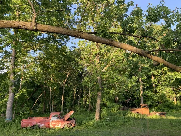 Tommy Gardner’s place was a bona fide junk yard. Entangled in wild grape vine, scavenged iron behemoths born from booms of post war foundries littered the four-acre lot five miles outside of Viroqua on Cty NN. Among the Case tractors and spent trucks, an eight-foot diameter, two-ton iron wheel wreathed in giant ragweed, burdock, and prairie sunflower was slowly sinking into the loam. Tommy passed from cancer before I got the chance to meet him. I bought the property in 2018, but from the stories I’ve gathered, he was a rendezvous-attending, muzzle-loading, buck skinner, whiz mechanic who had a bumper sticker on his truck that read: “I’m not a hippie…I’m a well-groomed mountain man.” A voice from my neat, orderly Iowa farm upbringing told me, “knock back the weeds, tidy the place up, and get the junk to the scrap yard.” But as I began to build a house using old rusty barn tin and boards with an “After Life” motif, Tommy’s junk started making its way into a repurposed collage that would become Sittin’ Pretty Farm.